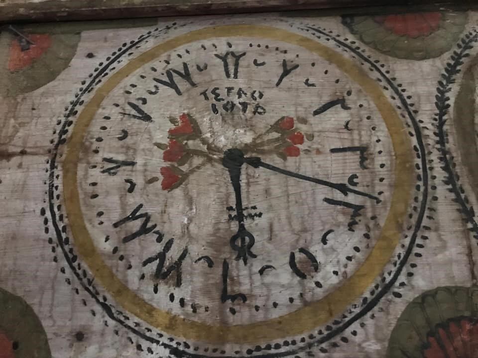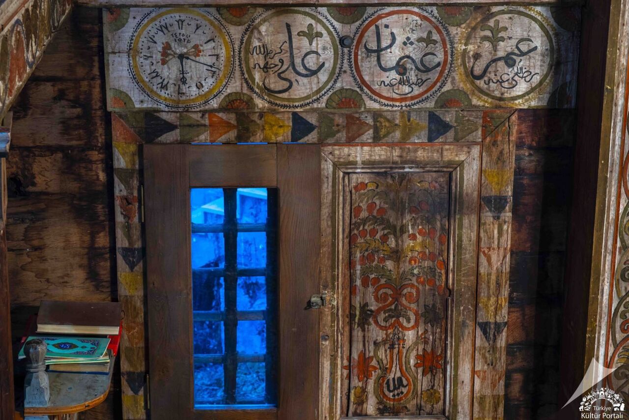 Bunların dışında mihrap duvarında, boyalı daire çerçeveler içinde Allah, Muhammed ve dört halifenin isimleri yazılmıştır. Halife isimlerinin yer aldığı bu daire çerçevelerin yanına boyama olarak, yine aynı büyüklükte, daire kadranlı ve rakamları Arapça olan bir saat şekli işlenmiştir.