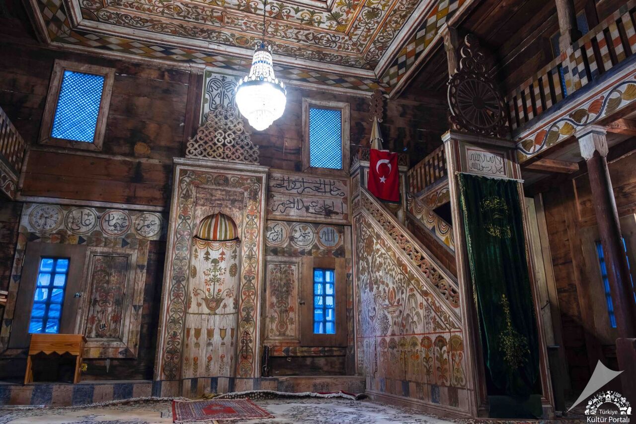 Caminin mihrap ve minberi de orijinaldir ve zengin süslemelerle bezelidir. Tavan, iç içe küçülen dörtgen çerçeveler halinde kademeli bir şekilde çatı boşluğuna doğru derinleşmekte ve en içte ise sekizgen bir çerçeve içine yerleştirilmiş dairesel bir göbekten oluşmaktadır.