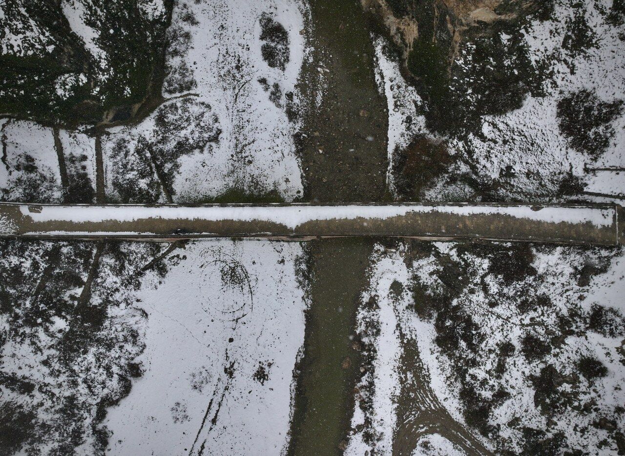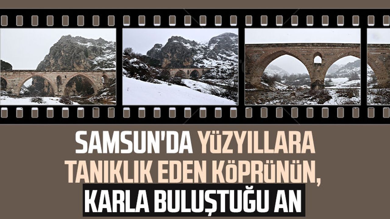 Tarihi köprünün karla buluşması dronla görüntülendi.