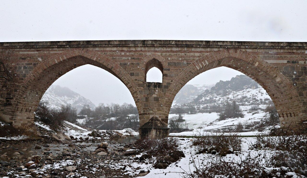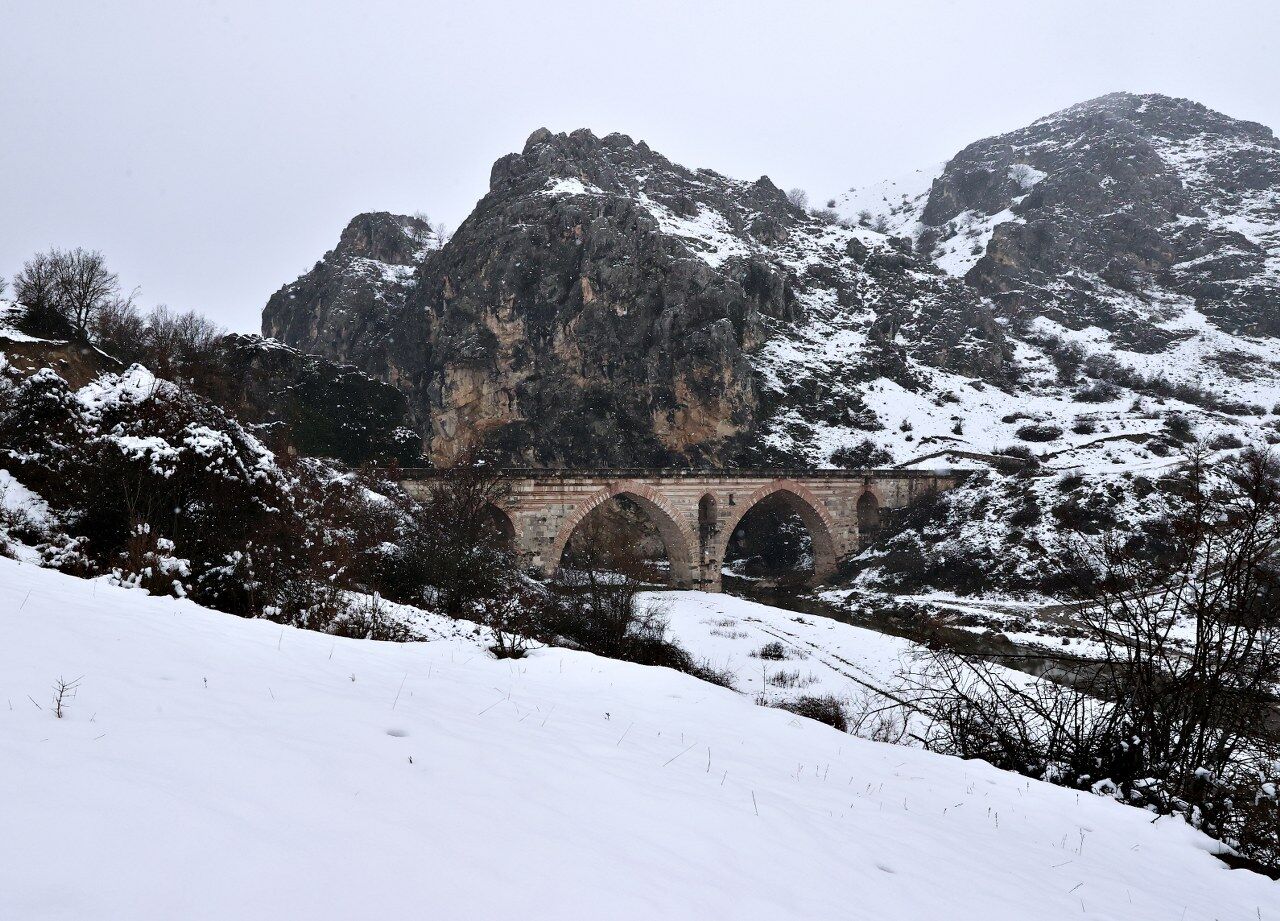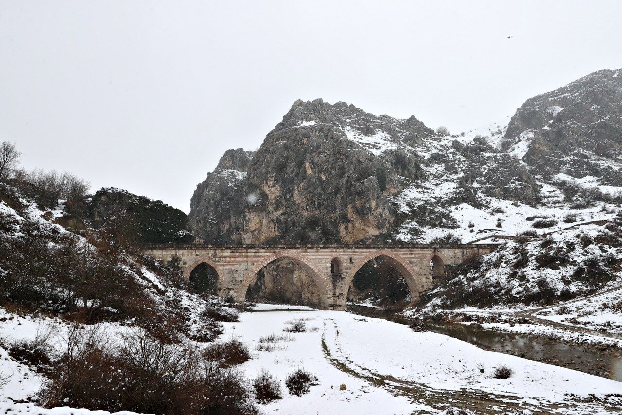 Karayolları Genel Müdürlüğü tarafından 2008 yılında restore edilerek araç trafiğine kapatılan Kurt Köprü, bölgede etkili olan kar yağışıyla beyaza büründü.