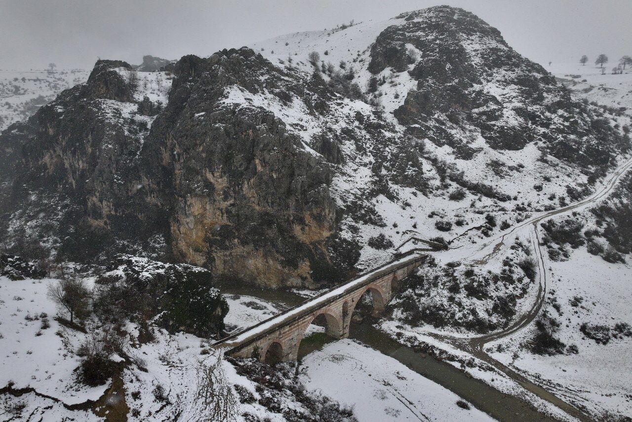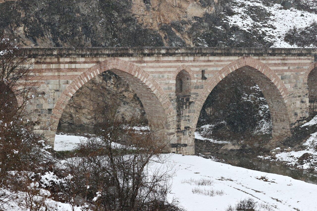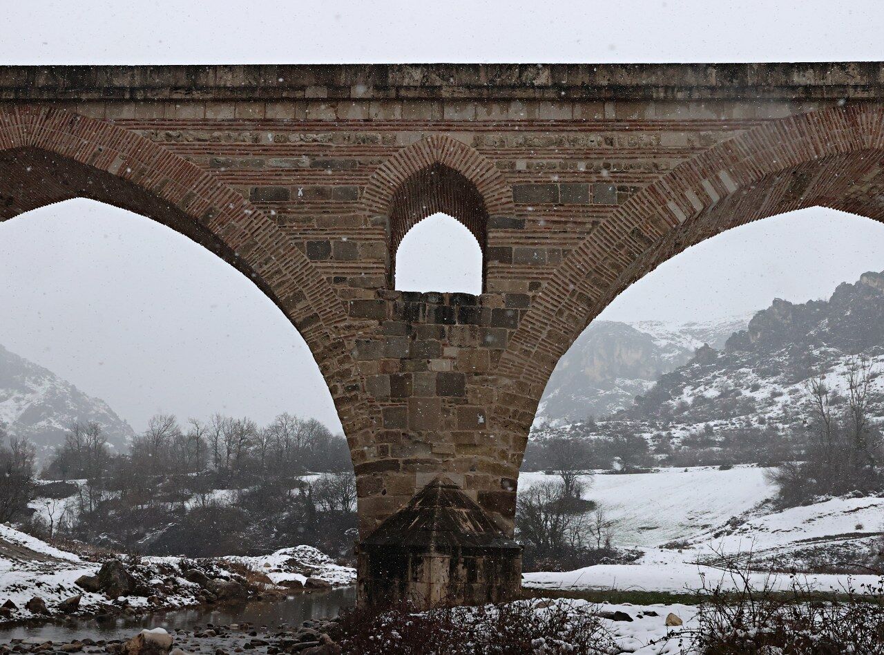 Karayolları Genel Müdürlüğü tarafından 2008 yılında restore edilerek araç trafiğine kapatılan Kurt Köprü, bölgede etkili olan kar yağışıyla beyaza büründü.