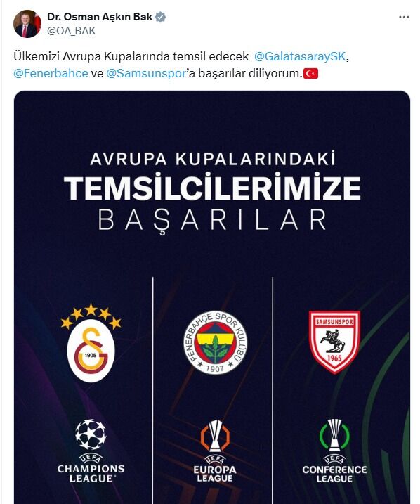 Avrupa kupalarında Türkiye’yi temsil edecek olan Samsunspor, Galatasaray ve Fenerbahçe’nin rakipleri belli oldu. Gençlik ve Spor Bakanı Osman Aşkın Bak, X hesabından yaptığı paylaşımda Samsunspor, Galatasaray ve Fenerbahçe’ye başarı temennisinde bulunarak, “Ülkemizi Avrupa kupalarında temsil edecek Galatasaray SK, Fenerbahçe ve Samsunspor’a başarılar diliyorum.” ifadelerini kullandı.