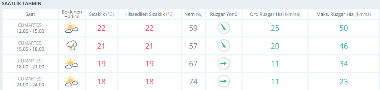 📌 Saat 12.00 - 15.00 aralığında hava parçalı bulutlu olacak. Sıcaklık 22°C, nem oranı ise %59 seviyelerinde seyredecek.