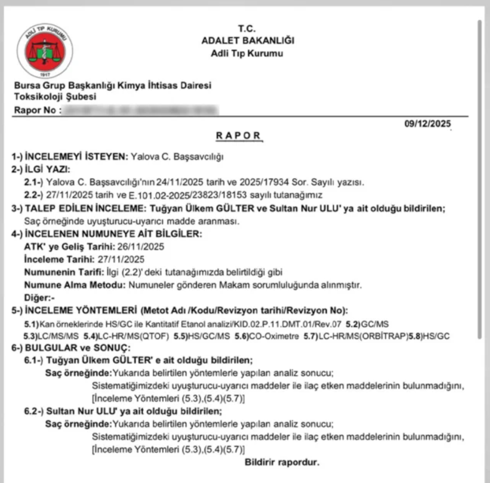 - Adli Tıp Kurumu Bursa Grup Başkanlığı uyuşturucu test raporunu hazırladı.
