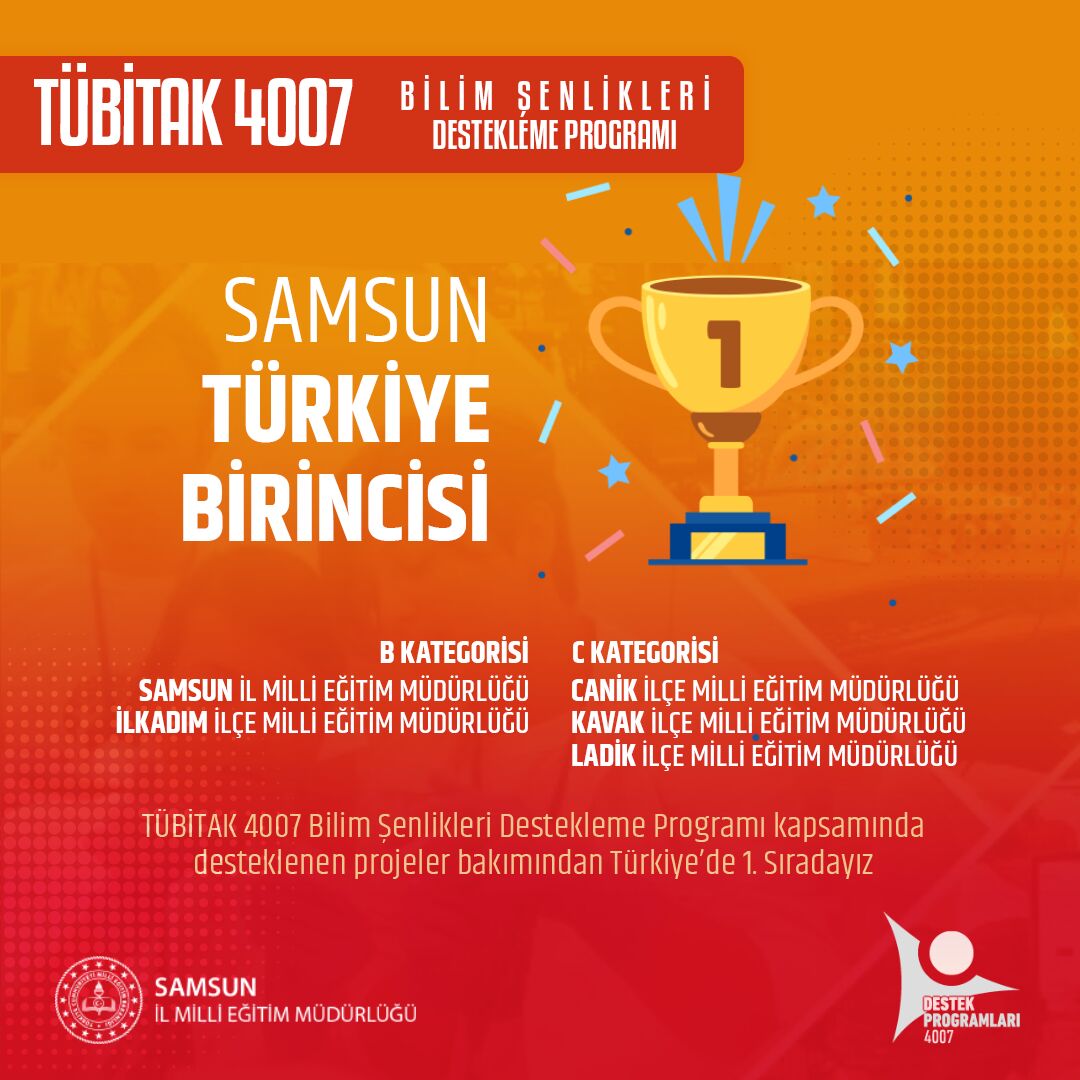 TÜBİTAK 4007 Bilim Şenlikleri Destekleme Programı ve TÜBİTAK 4008 Özel Gereksinimli Bireylere Yönelik Kapsayıcı Toplum Uygulamaları Destekleme Programı kapsamında Samsun İl Mili Eğitim Müdürlüğünden yapılan 9 başvurudan 7’si desteklenmeye hak kazandı.