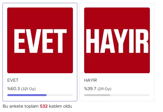 Samsungazetesi.com internet sitesinde yayınlanan ankette toplam 586 kişi oy kullandı. Katılımcıların 321'i “Evet”, 211'i ise “Hayır” oyu verdi. Sonuçlara göre “Evet” oylarının önde olduğu görüldü.