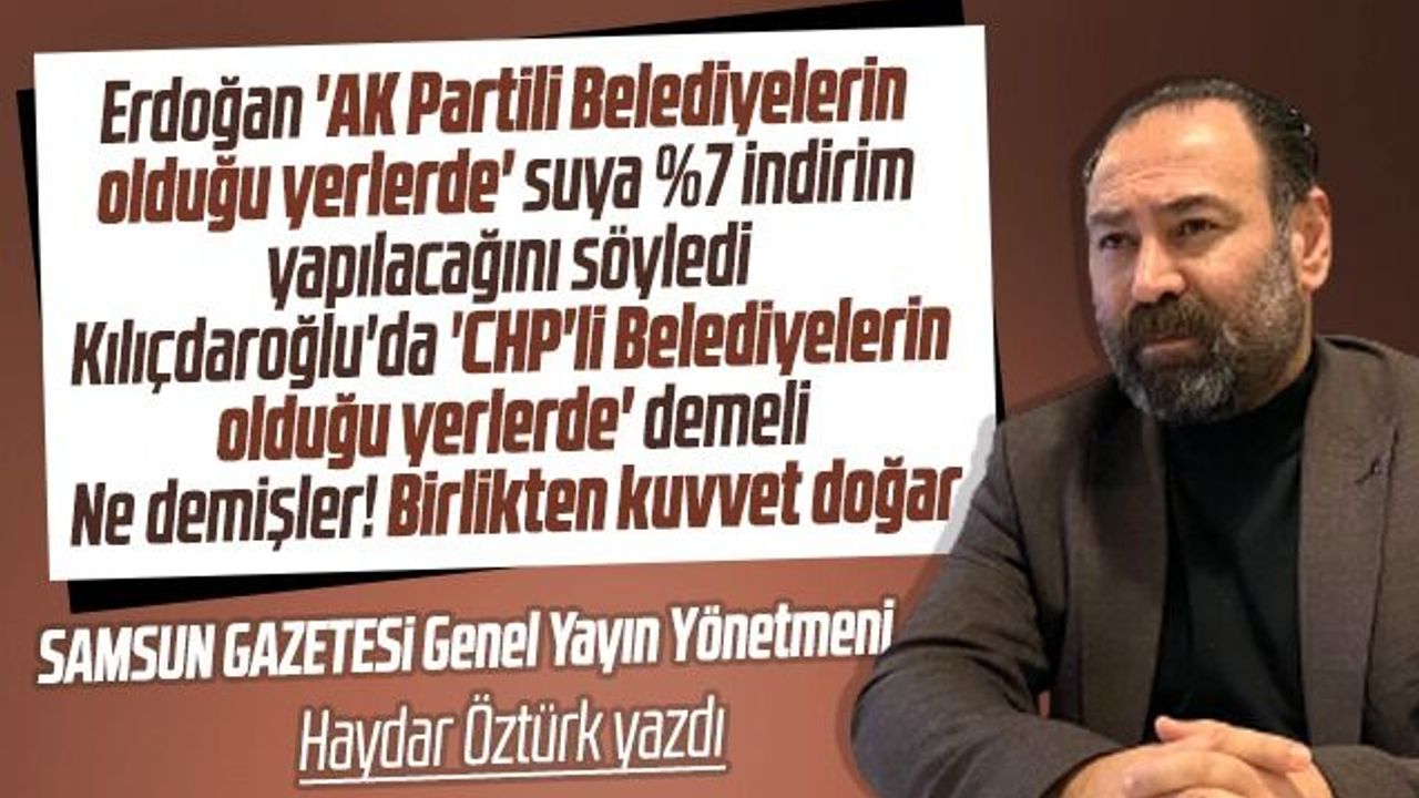 Samsun Gazetesi Genel Yayın Yönetmeni Haydar Öztürk, Cumhurbaşkanı Erdoğan'ın 'AK Partili Belediyelerin olduğu yerlerde' suya yüzde 7 indirim yapılacağını söylediğini hatırlatarak, "Kılıçdaroğlu'da 'CHP'li Belediyelerin olduğu yerlerde' demeli. Birlikten kuvvet doğar" dedi.