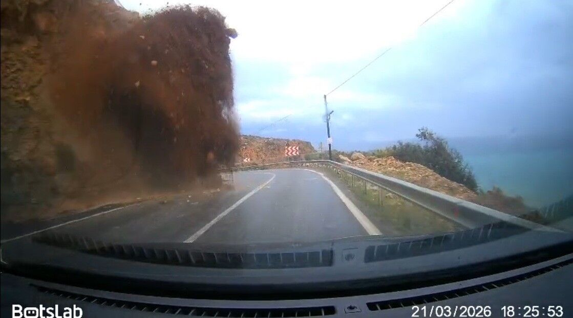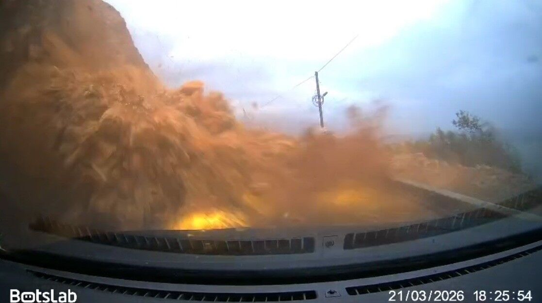 Araç kamerasına yansıyan görüntülerde, otomobilin bir anda toprak ve kaya parçalarının altında kaldığı, hava yastıklarının açıldığı ve ön camın kırıldığı anlar yer aldı.