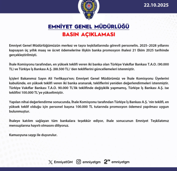Emniyet Genel Müdürlüğü (EGM), merkez ve taşra teşkilatında görev yapan personelin 2025-2028 yıllarını kapsayan maaş ve ücret ödemeleri için yapılan banka promosyon ihalesinin sonuçlandığını açıkladı.