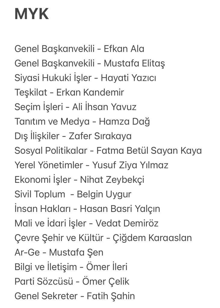 AK Parti genel merkezinde basına kapalı gerçekleşen toplantı 3 saat 45 dakika sürdü. AK Parti'de yeni MYK da belli oldu. Genel Başkanvekili Efkan Ala ve Mustafa Elitaş oldu. Ömer Çelik, parti sözcülüğü görevine devam edecek.