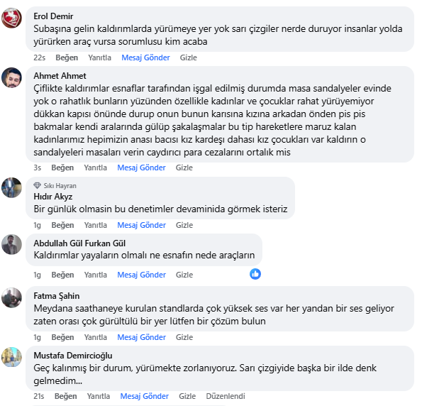 Abdullah Furkan Gül, “Kaldırımlar yayaların olmalı; ne esnafın, ne de araçların.” sözleriyle tepkisini dile getirirken, Fatma Şahin ise saat kulesi çevresindeki gürültüden şikayet ederek, “Meydandaki saat kulesinin oraya kurulan stantlarda çok yüksek ses var. Her yandan bir ses geliyor. Zaten orası çok gürültülü bir yer. Lütfen bir çözüm bulun.” dedi.