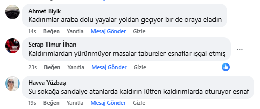 Serap Timur İlhan, “Kaldırımlarda yürünmüyor. Masalar, tabureler… Esnaflar kaldırımları işgal etmiş.” diyerek duruma dikkat çekerken, Havva Yüzbaşı da “Şu sokağa sandalye atanları da kaldırın lütfen. Kaldırımlarda oturuyor esnaf.” ifadeleriyle kaldırımlardaki düzensizliğe tepki gösterdi.
