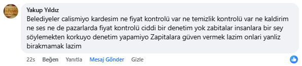 Yakup Yıldız, “Belediyeler çalışmıyor kardeşim. Ne fiyat kontrolü var, ne temizlik kontrolü. Ne kaldırım, ne ses denetimi, ne de pazarlarda fiyat kontrolü… Ciddi bir denetim yok. Zabıtalar insanlara bir şey söylemekten korkuyor, denetim yapamıyor. Zabıtaya güven vermek, onları yalnız bırakmamak lazım.” ifadelerini kullandı.