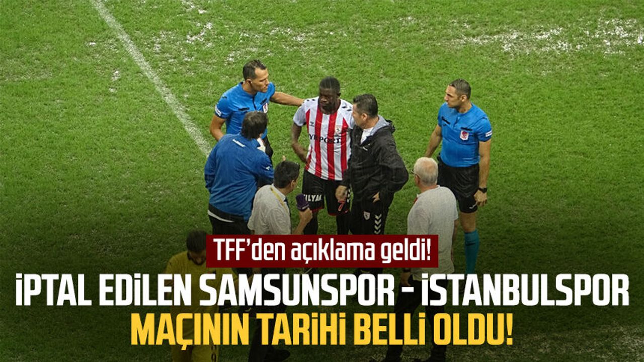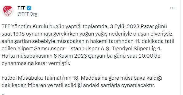 TFF'den yapılan açıklamada, "Yoğun yağış nedeniyle oluşan elverişsiz saha şartları sebebiyle müsabakanın hakemi tarafından 11. dakikada tatil edilen Yılport Samsunspor - İstanbulspor A.Ş. Trendyol Süper Lig 4. Hafta müsabakasının 8 Kasım 2023 Çarşamba günü saat 20.00’de oynanmasına karar vermiştir. Futbol Müsabaka Talimatı’nın 18. Maddesine göre müsabaka kaldığı dakikadan itibaren ve tatil edildiği andaki şartlarla oynatılacaktır" denildi.
