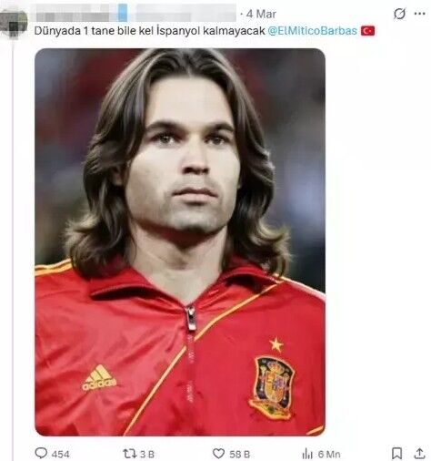 Türkiye’de bir sosyal medya kullanıcısı, İspanya’nın kararına teşekkür etmek için dikkat çekici ve mizahi bir paylaşım yaptı. Paylaşımda eski İspanyol futbolcu Andres Iniesta’nın İspanya Milli Takımı formasıyla yer aldığı bir fotoğraf kullanıldı. Ancak fotoğrafa montajla uzun ve dalgalı saçlar eklenerek eğlenceli bir görüntü oluşturuldu.