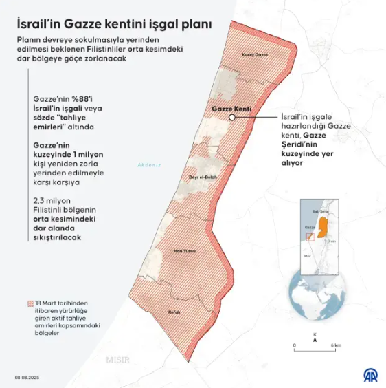 Başbakan Binyamin Netanyahu başkanlığında toplanan Güvenlik Kabinesi, Gazze kentinin işgal edilmesine yönelik plana onay verdi. Beklentilerin aksine Gazze Şeridi'nin tamamı yerine kuzeydeki Gazze kentinin işgaline karar verilmesi dikkati çekti.