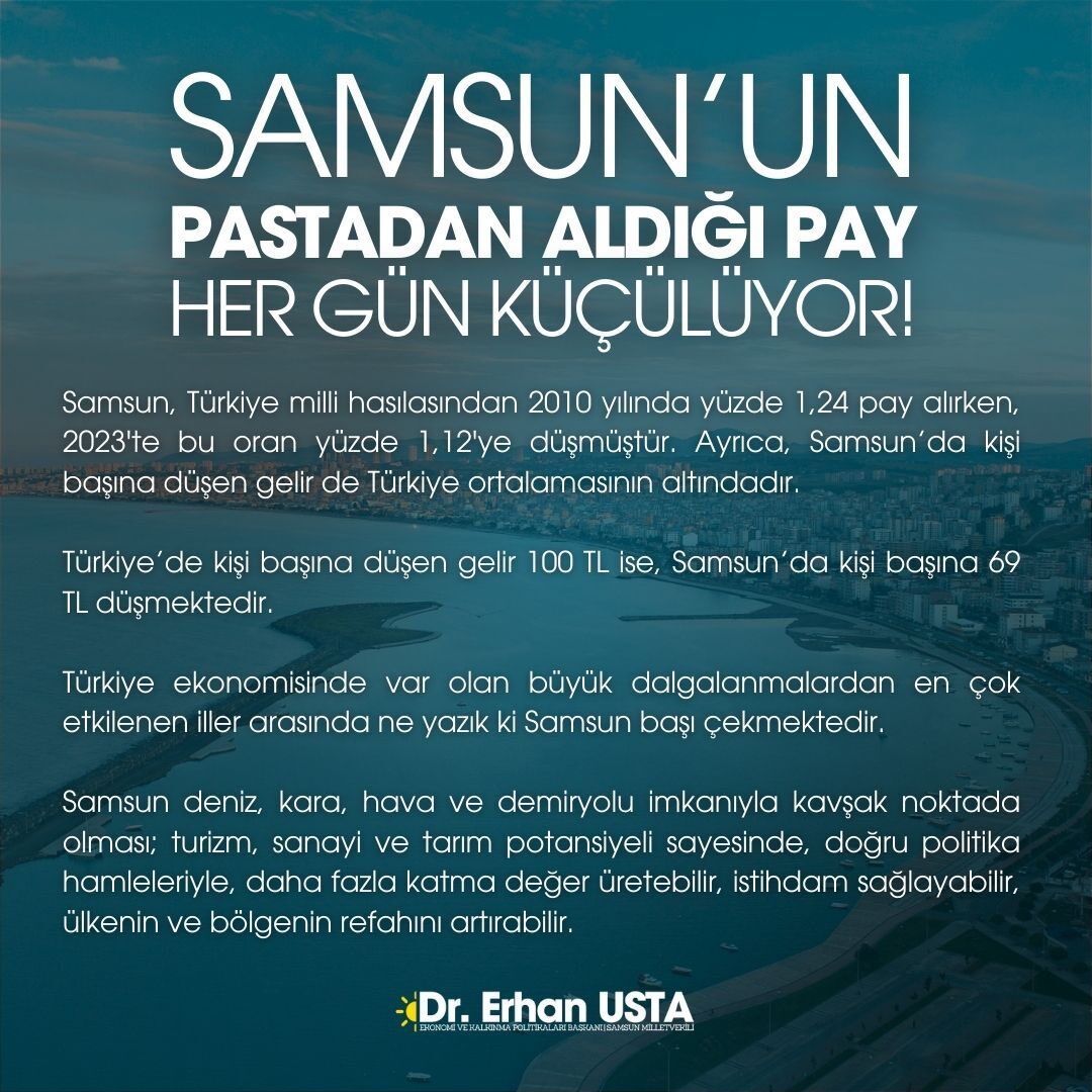 İYİ Parti Ekonomi ve Kalkınma Politikaları Başkanı Dr. Erhan Usta, "Samsun, Türkiye milli hasılasından 2010 yılında yüzde 1,24 pay alırken, 2023’te bu oran yüzde 1,12’ye düşmüştür. Ayrıca, Samsun’da kişi başına düşen gelir de Türkiye ortalamasının altındadır" dedi.