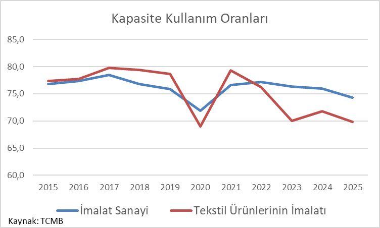 Usta, tekstil ve hazır giyim sanayinde üretim kapasitesinin ciddi biçimde düştüğünü ifade ederek, “Bu sektörlerdeki kapasite kullanım oranları, pandemiden bu yana en düşük seviyelerde” dedi.