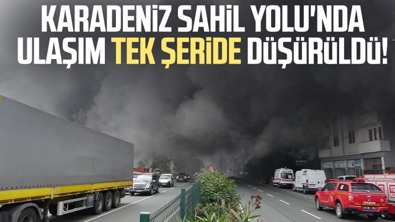 Yangın nedeniyle Karadeniz Sahil Yolu'nda ulaşım tek şeritten kontrollü olarak verilirken, yangın söndürme çalışmaları sürüyor.