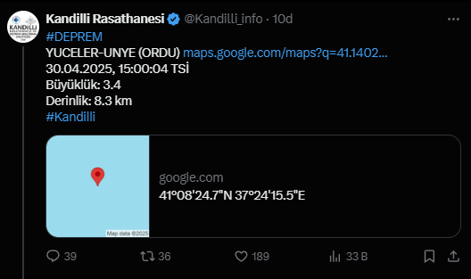 Kandilli Rasathanesi, 30 Nisan 2025 Çarşamba günü saat 15.00’te, Ordu’nun Ünye ilçesine bağlı Yüceler mevkisinde 3.4 büyüklüğünde bir deprem meydana geldiğini duyurdu. Afet ve Acil Durum Yönetimi Başkanlığı (AFAD) verilerine göre, sarsıntı yerin 8.3 kilometre derinliğinde kaydedildi.
