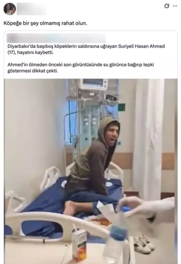 Diyarbakır’ın Ergani ilçesinde başıboş köpeklerin saldırısına uğrayan Suriye uyruklu iki kardeşten Hasan Ahmed’e kuduz teşhisi konuldu. Durumu ağırlaşan küçük çocuk, doktorların tüm çabalarına rağmen hayatını kaybederken, hastanedeki son anlarına ilişkin görüntüler ile sonrasında sosyal medyada yapılan bir paylaşım büyük tepki çekti.