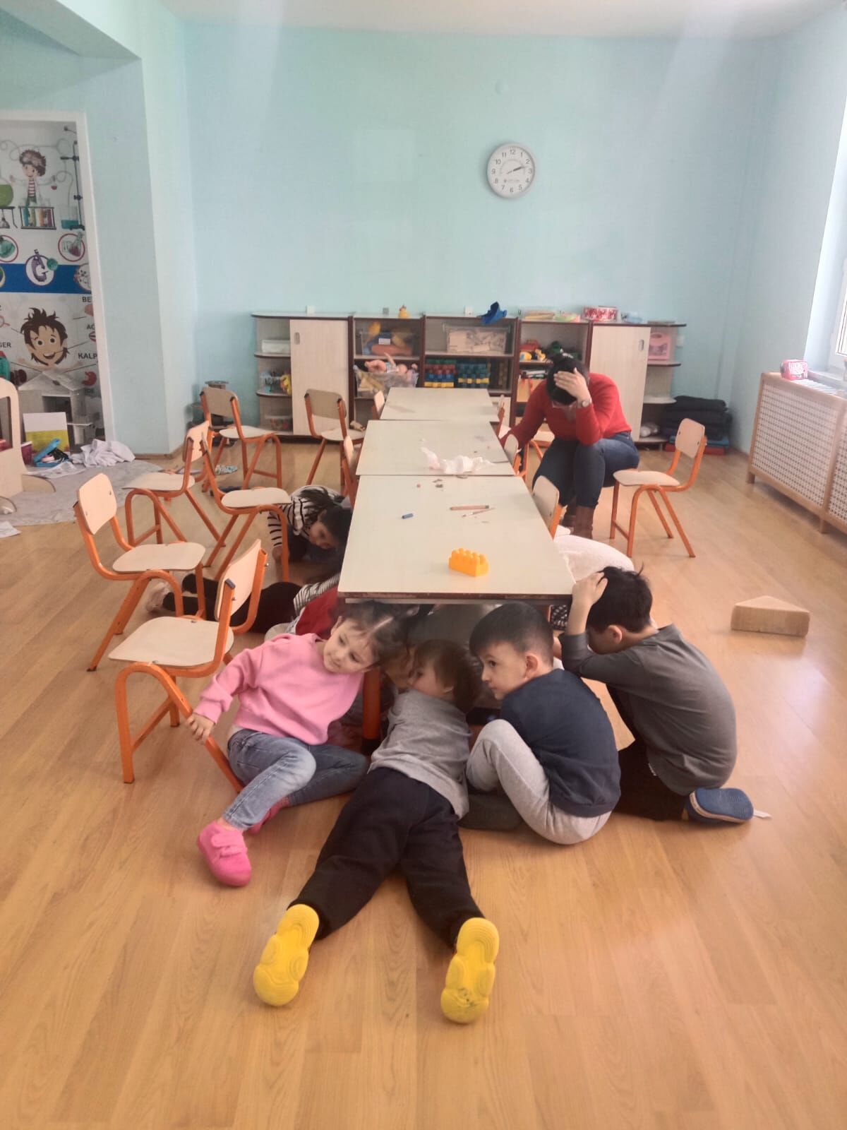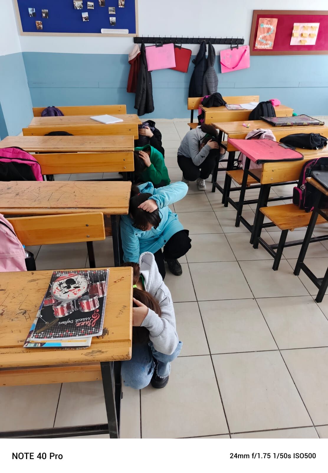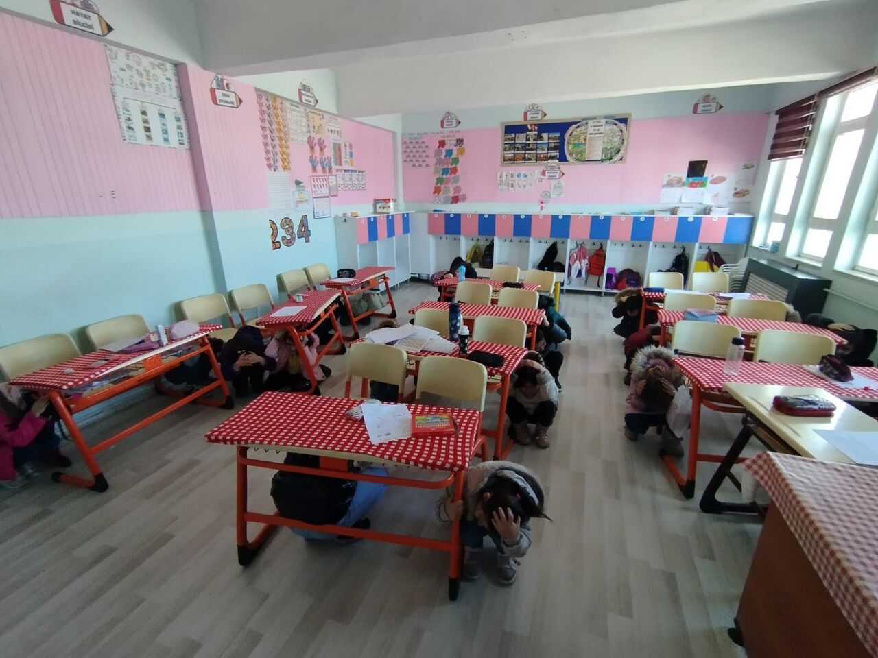 Ardından çalan siren sesiyle öğrenciler, "çök, kapan, tutun" hareketi yaparak zil sesinin bitmesi bekledi.