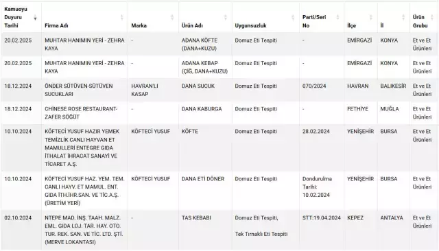 "Sağlığı Tehlikeye Düşürecek Gıdalar" başlığıyla yayımlanan listeye göre, Türkiye genelinde şu ana kadar 7 farklı işletmede domuz eti satışı tespit edildi. Bu işletmelerin dağılımına bakıldığında: