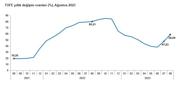 TÜFE'deki (2003=100) değişim ağustos ayında bir önceki aya göre %9,09, bir önceki yılın aralık ayına göre %43,06, bir önceki yılın aynı ayına göre %58,94 ve on iki aylık ortalamalara göre %56,28 olarak gerçekleşti. Bir önceki yılın aynı ayına göre en az artış gösteren ana grup %24,97 ile konut oldu. Buna karşılık, bir önceki yılın aynı ayına göre artışın en yüksek olduğu ana grup ise %89,31 ile lokanta ve oteller oldu.