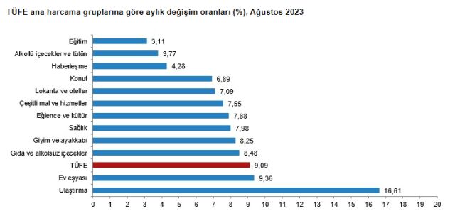 Ana harcama grupları itibarıyla 2023 yılı Ağustos ayında bir önceki aya göre en az artış gösteren ana grup %3,11 ile eğitim oldu. Buna karşılık, 2023 yılı Ağustos ayında bir önceki aya göre artışın en yüksek olduğu ana grup ise %16,61 ile ulaştırma oldu.