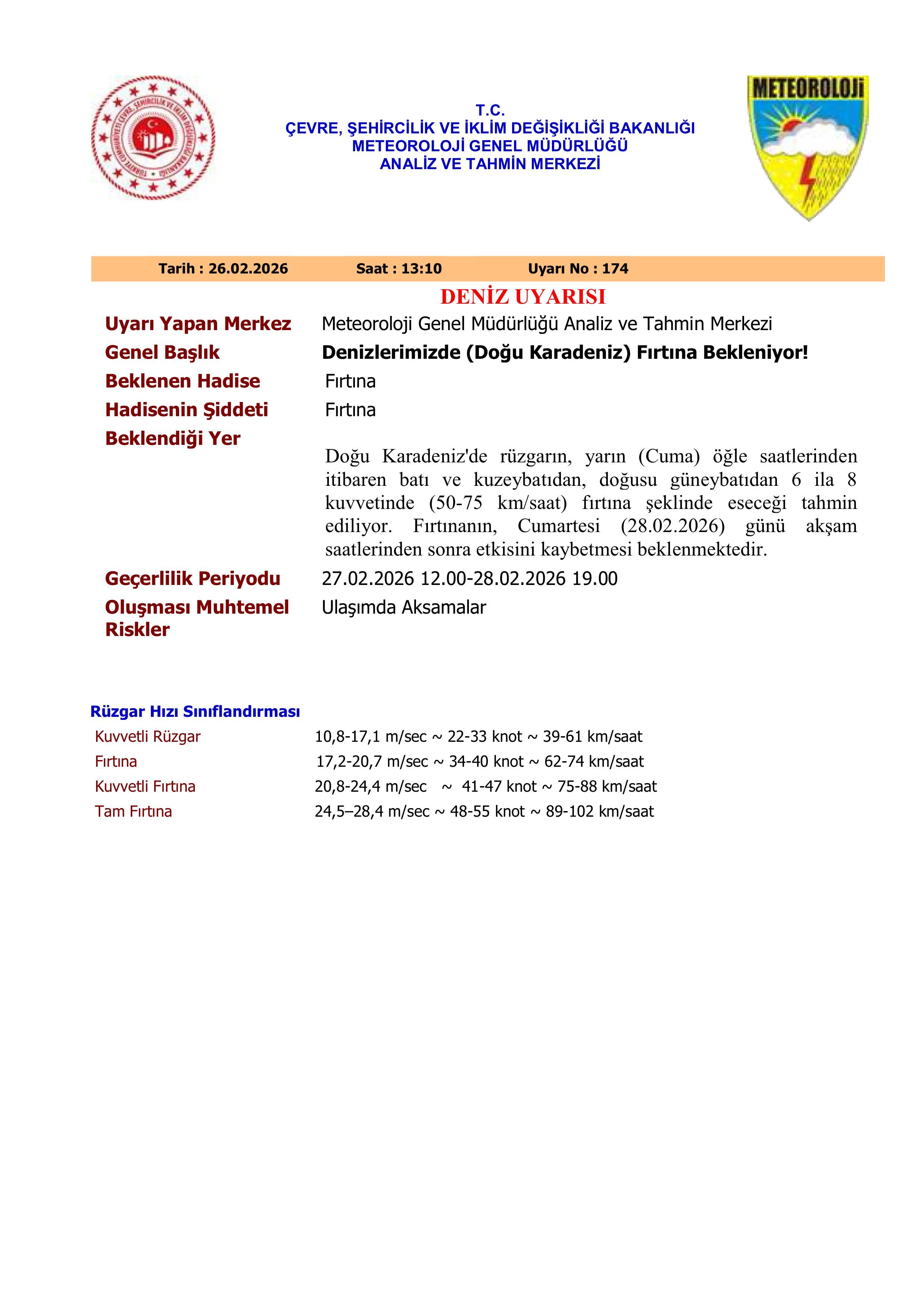 27 Şubat 2026 saat 12.00 ile 28 Şubat 2026 saat 19.00 arasında etkili olması beklenen fırtına nedeniyle özellikle deniz ulaşımında aksamalar yaşanabileceği bildirildi. Yetkililer, vatandaşların ve denizcilerin dikkatli ve tedbirli olmaları konusunda uyarıda bulundu.