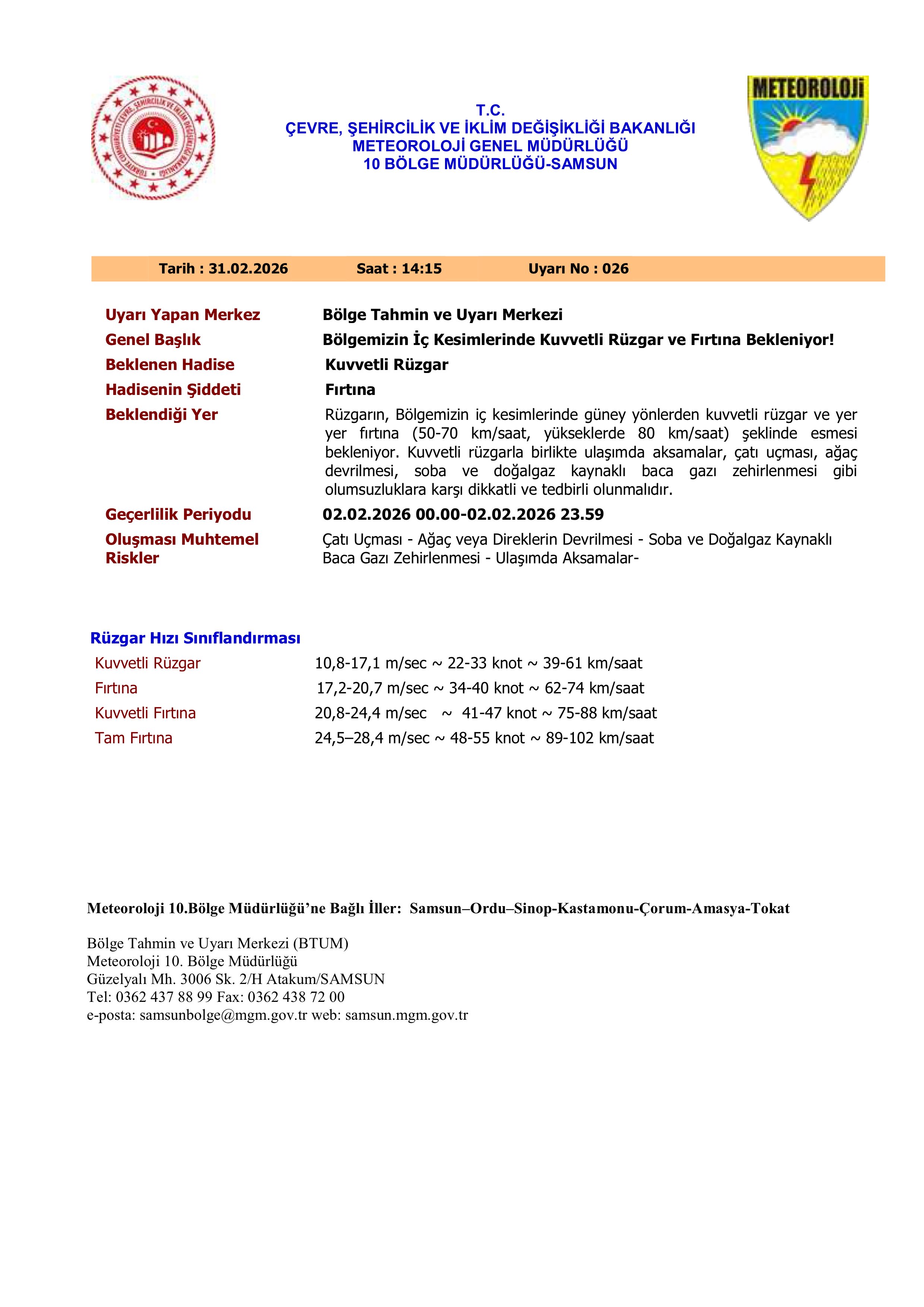 - Samsun ve çevresi, 2 Şubat 2026 00.00–23.59 arası fırtına uyarısı.