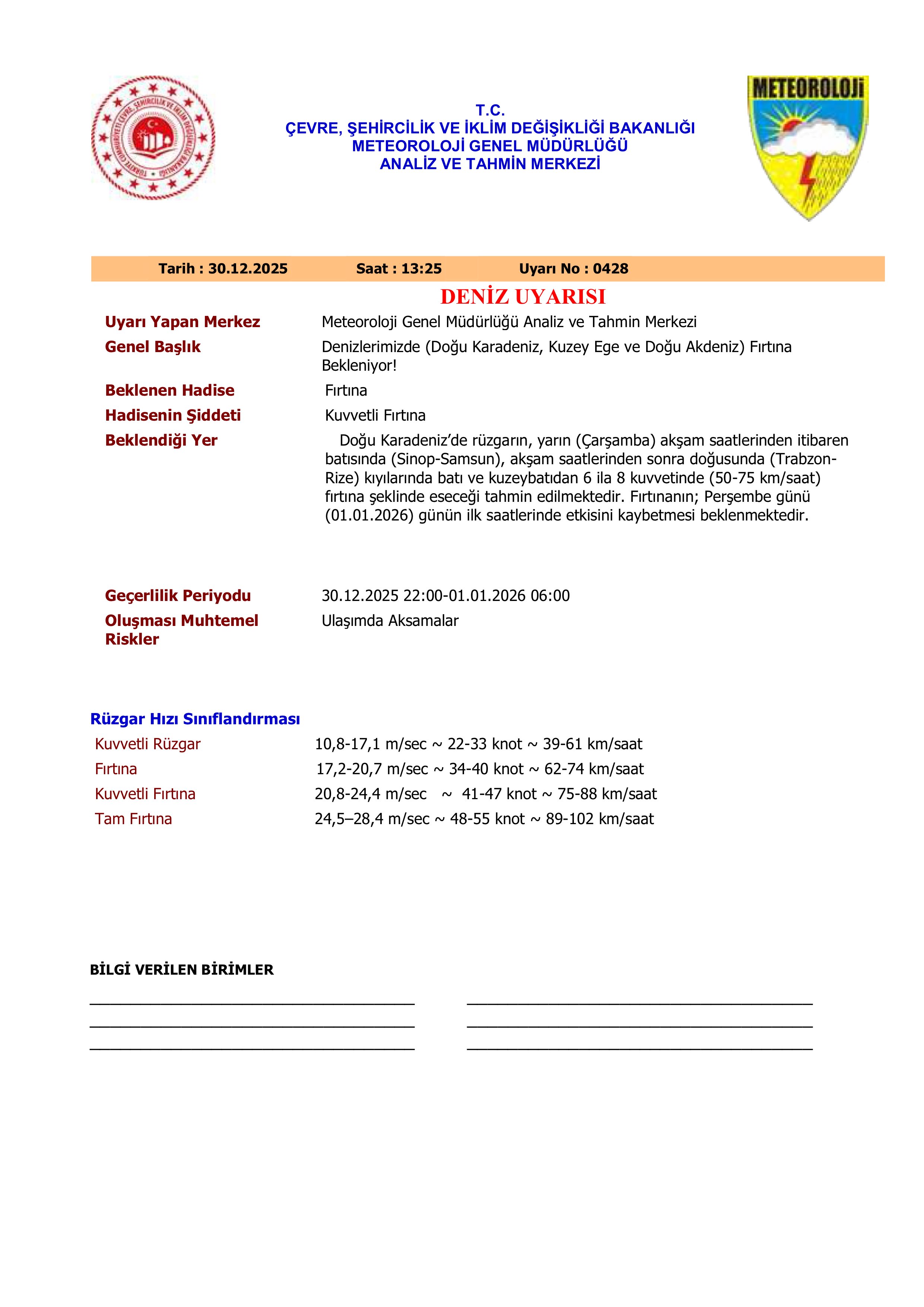 - Karadeniz’de 30 Aralık 2025 22.00’dan itibaren fırtına bekleniyor.