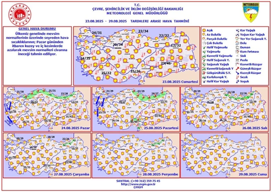 Meteoroloji Genel Müdürlüğü'nün yayımladığı 6 günlük hava tahmin raporuna göre; ülke genelinde mevsim normallerinin üzerinde seyreden sıcaklıkların, Pazar gününden itibaren özellikle kuzey ve iç kesimlerde düşerek mevsim normalleri civarına gerilemesi bekleniyor.