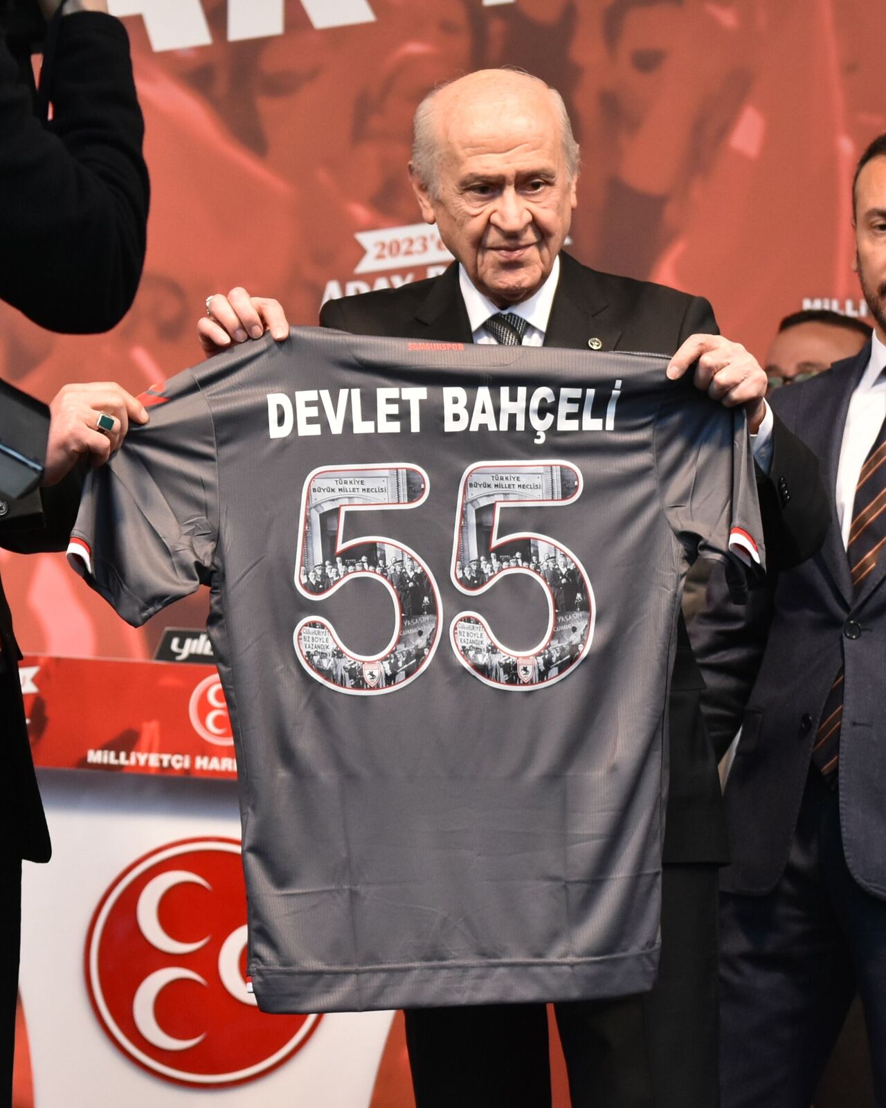 Cumhur İttifakı olarak adaylarının Recep Tayyip Erdoğan olduğunun altını çizen Bahçeli, “Bulanık suda balık avlama merakında değiliz. Belirsizliğin rotasını takip etme anlayışında değiliz. Makam, mevki, servet, şöhret devşirme arayışında hiç değiliz. Cumhuriyet’in 100’üncü yıl dönümünü cumhurun zaferiyle taçlandırmanın gayesindeyiz. Bu haklı ve tarihi mücadelemizde yol haritamız bellidir. Türk ve Türkiye yüzyılına milli birlik ve kardeşlik şuuruyla ulaşmanın azmindeyiz. 2023 yılında yapılacak Cumhurbaşkanı ve Milletvekili Genel Seçimlerini Türk milletinin karar anı, Türk tarihinin yol ağzı, Cumhuriyet’in yeni yüzyılla demokratik sözleşmesi olarak değerlendiriyoruz. Seçimlere giden süreçte adayımız belli, kararımız nettir. Karar verdik, mutlaka tatbik ve takip edeceğiz. Cumhur İttifakı olarak beraberliğimizi sonuna kadar koruyacağız. Hiçbir gevşemeye, suizanna, gönül kırgınlığına müsaade etmeyeceğiz. Seçime kadar değil Türkiye yüzyılının çatısını el birliğiyle öresiye kadar, aziz milletimizi medeniyetler ve milletler mücadelesinde üst lige taşıyana kadar biriz, diriyiz, birlikte cumhurun ruh kökü, Cumhuriyet’in sarsılmaz güvencesiyiz. Diyorum ki, Cumhur İttifakı Türkiye’dir. Cumhur İttifakı pazarlıksız, aracısız, hesapsız, hilafsız, hilesiz vatan türbedarı, Türk milletinin has bahçesidir. Milliyetçi Hareket Partisi’nin ve Cumhur İttifakı’nın Cumhurbaşkanı adayı da Sayın Recep Tayyip Erdoğan’dır. Birinci hedefimiz Sayın Cumhurbaşkanımızın, Cumhurbaşkanlığı Hükümet Sistemi’nin ikinci döneminde de çok yüksek bir oy oranıyla seçilmesi, başarılı çalışmalarına ara vermeden devam etmesidir. İkinci hedefimiz, Milliyetçi Hareket Partisi’nin milletvekili sayısıyla siyasal destek seviyesini en çoklaştırmak, yıllardır layık olduğumuz hakkımızı milli iradenin oluruyla almaktır. Nihai arzumuz, Cumhur İttifakı’nın TBMM’de çok güçlü bir temsil imkanına kavuşmasıdır” şeklinde konuştu.