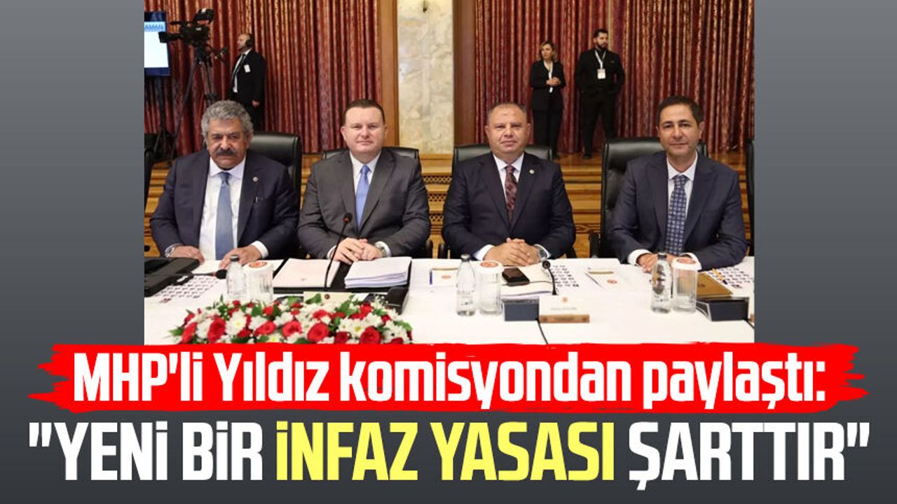 MHP Genel Başkan Yardımcısı, İstanbul Milletvekili ve komisyon üyesi Feti Yıldız, diğer MHP'li komisyon üyeleri Sakarya Milletvekili Muhammet Levent Bülbül, Kırıkkale Milletvekili Halil Öztürk ve Tokat Milletvekili Yücel Bulut ile çekilmiş bir fotoğrafı resmi X hesabından paylaştı. Komisyondan paylaşım yapan Yıldız, "Yeni bir infaz yasası şarttır" başlığıyla bir açıklama yayımladı.