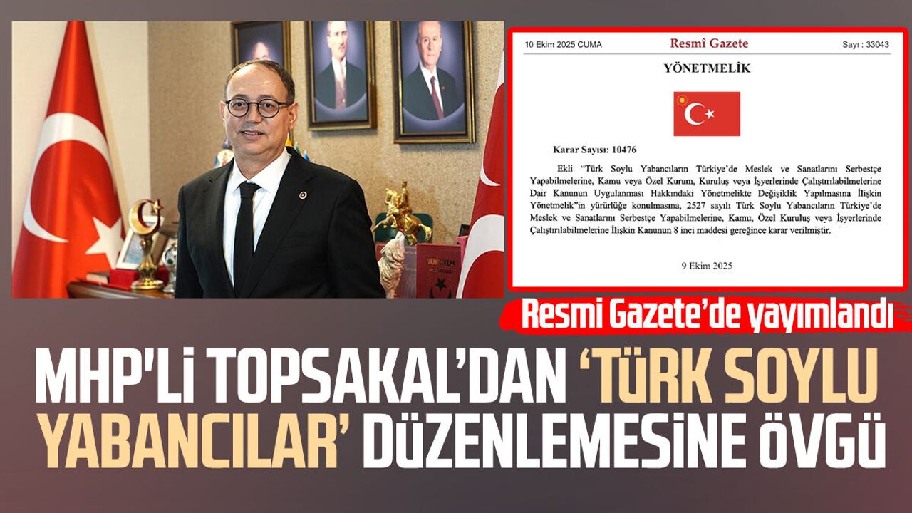 MHP’li Prof. Dr. İlyas Topsakal, Resmî Gazete’de yayımlanan Cumhurbaşkanı Kararı’yla, Türk soylu yabancıların Türkiye’de meslek ve sanatlarını serbestçe icra edebilmelerine ilişkin yönetmelikte yapılan değişikliğin, Türk dünyasıyla olan sosyal, kültürel ve ekonomik ilişkileri daha da güçlendireceğini belirtti.