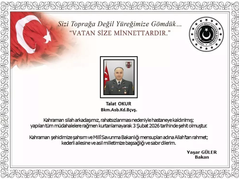 Milli Savunma Bakanlığı (MSB), Bakım Astsubay Kıdemli Başçavuş Talat Okur’un geçirdiği ani rahatsızlık sonrası hastaneye kaldırıldığını, ancak yapılan tüm müdahalelere rağmen kurtarılamayarak 3 Şubat’ta şehit olduğunu duyurdu.