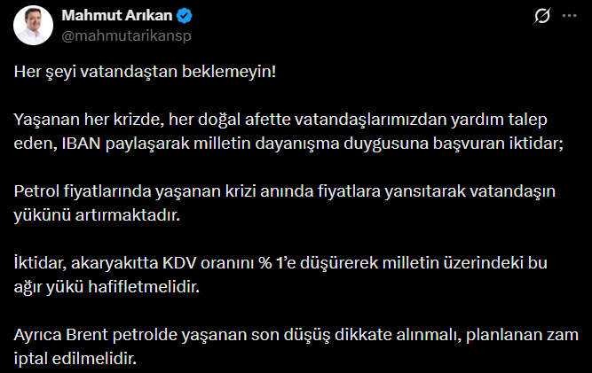 Arıkan, sosyal medya hesabından yaptığı açıklamada, “Her şeyi vatandaştan beklemeyin! Yaşanan her krizde, her doğal afette vatandaşlarımızdan yardım talep eden, IBAN paylaşarak milletin dayanışma duygusuna başvuran iktidar; Petrol fiyatlarında yaşanan krizi anında fiyatlara yansıtarak vatandaşın yükünü artırmaktadır. İktidar, akaryakıtta KDV oranını yüzde 1’e düşürerek milletin üzerindeki bu ağır yükü hafifletmelidir. Ayrıca Brent petrolde yaşanan son düşüş dikkate alınmalı, planlanan zam iptal edilmelidir.” ifadelerini kullandı.