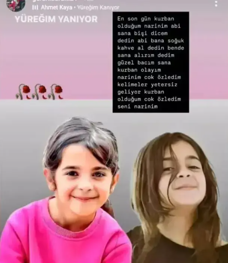Kardeşinin kendisinden soğuk kahve istediğini söyleyen Baran Güran, "En son gün kurban olduğum Narin'im 'Abi sana bir şey diyeceğim' dedin. 'Abi bana soğuk kahve al' dedin. Ben de 'Sana alırım' dedim. Güzel bacım sana kurban olayım. Narin'im çok özledim. Kelimeler yetersiz geliyor kurban olduğum. Çok özledim seni Narin'im." dedi.