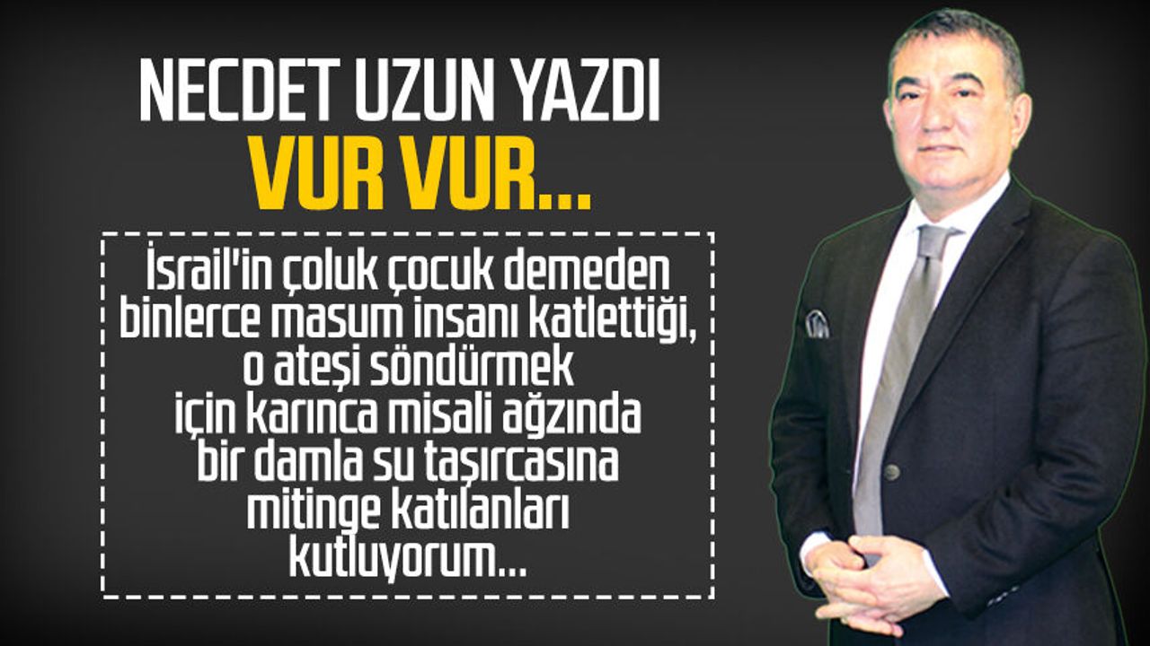 İsrail'in çoluk çocuk demeden binlerce masum insanı katlettiği, o ateşi söndürmek için karınca misali ağzında bir damla su taşırcasına mitinge katılanları kutluyorum...