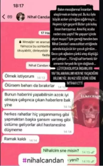 @i.likechaos isimli magazin sayfası Nihal Candan'ın gazeteci bir basın mensubuna attığı son mesajları paylaştı. Candan mesajında "Ölmek istiyorum" dedi ve ekledi, "Ölürsem Bahar'ı da bırakırlar bunun haberini de yapabilirsin azıcık iyi olunca çıkan haberlere bak! Herkes rahatlar hiç yaşanmamış gibi yapmaktan başka şansım varmış gibi üstüme geliyorlar..."