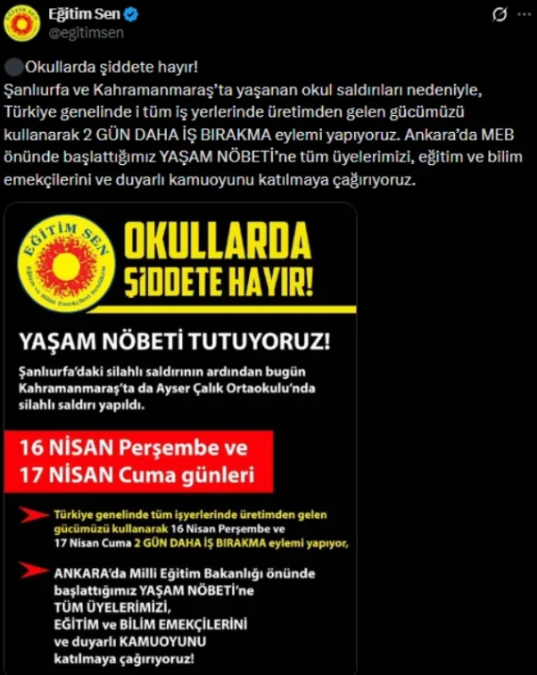 Eğitim-Sen’in resmi sosyal medya hesabından yapılan açıklamada, “Şanlıurfa ve Kahramanmaraş’ta yaşanan okul saldırıları nedeniyle, Türkiye genelinde tüm iş yerlerinde üretimden gelen gücümüzü kullanarak 2 GÜN DAHA İŞ BIRAKMA eylemi yapıyoruz. Ankara’da MEB önünde başlattığımız YAŞAM NÖBETİ’ne tüm üyelerimizi, eğitim ve bilim emekçilerini ve duyarlı kamuoyunu katılmaya çağırıyoruz.” ifadeleri kullanıldı.