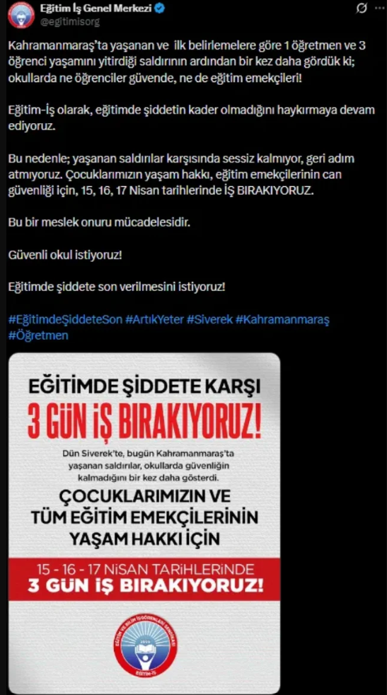 Eğitim-İş tarafından yapılan açıklamada ise şu ifadelere yer verildi: “Kahramanmaraş’ta yaşanan ve ilk belirlemelere göre 1 öğretmen ve 3 öğrenci yaşamını yitirdiği saldırının ardından bir kez daha gördük ki; okullarda ne öğrenciler güvende, ne de eğitim emekçileri! Eğitim-İş olarak, eğitimde şiddetin kader olmadığını haykırmaya devam ediyoruz. Bu nedenle; yaşanan saldırılar karşısında sessiz kalmıyor, geri adım atmıyoruz. Çocuklarımızın yaşam hakkı, eğitim emekçilerinin can güvenliği için, 15, 16, 17 Nisan tarihlerinde İŞ BIRAKIYORUZ. Bu bir meslek onuru mücadelesidir.”