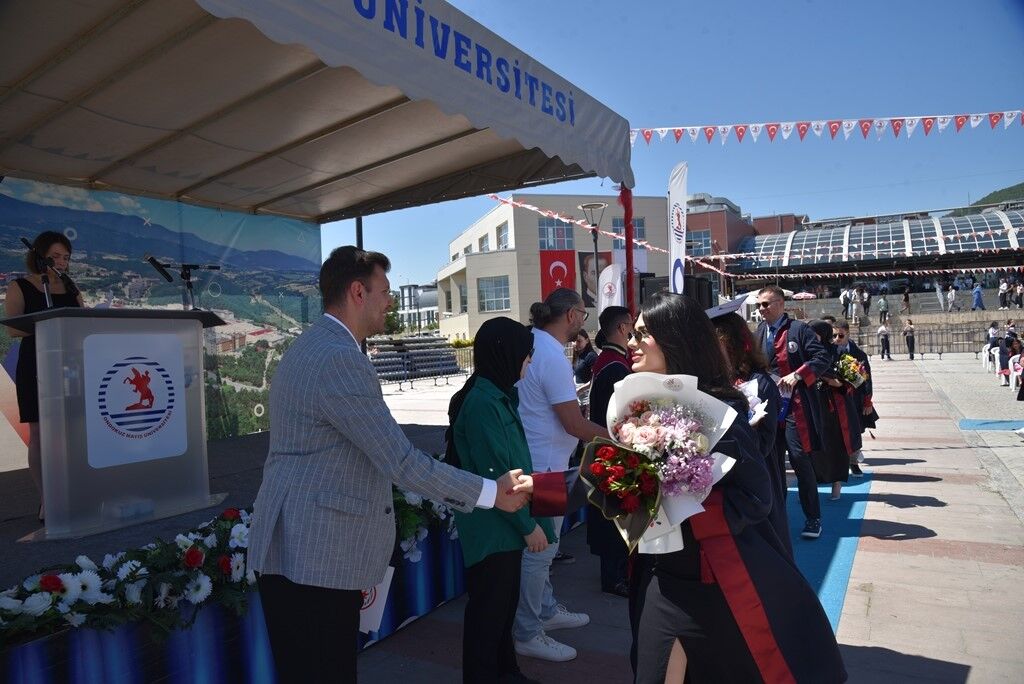 Saygı duruşu ve İstiklal Marşı ile başlayan törende konuşan Rektör Yardımcısı Prof. Dr. Ayşe Pınar Sumer, "Yıllar süren emek, fedakarlık ve kararlılıkla ulaştığınız bu noktada sadece bir diplomayı değil aynı zamanda büyük bir sorumluluğu da omuzlarınıza alıyorsunuz. Buradan mezun olurken yalnızca bir meslek sahibi olmuyorsunuz; değişen dünyanın ihtiyaçlarına cevap verebilecek, çözüm üretebilecek, yön gösterebilecek bireyler olarak da hayata adım atıyorsunuz. Hangi alanda ilerlemeyi seçerseniz seçin temelinde etik duruş ve bilimsel yaklaşım yer alır. Bugünün dünyası; değişken, hızlı ve çok boyutlu. Bu dinamik yapıda fark oluşturacak olanlar, sorgulayan, sürekli öğrenen ve toplumsal fayda üretmeyi amaçlayan bireylerdir. Sizlerin bu anlayışla hareket edeceğinize inancımız tam. Yolunuz açık, geleceğiniz aydınlık olsun" dedi.