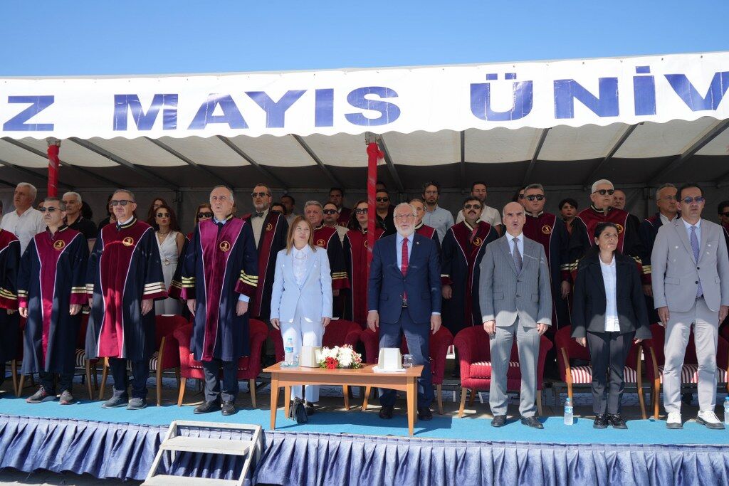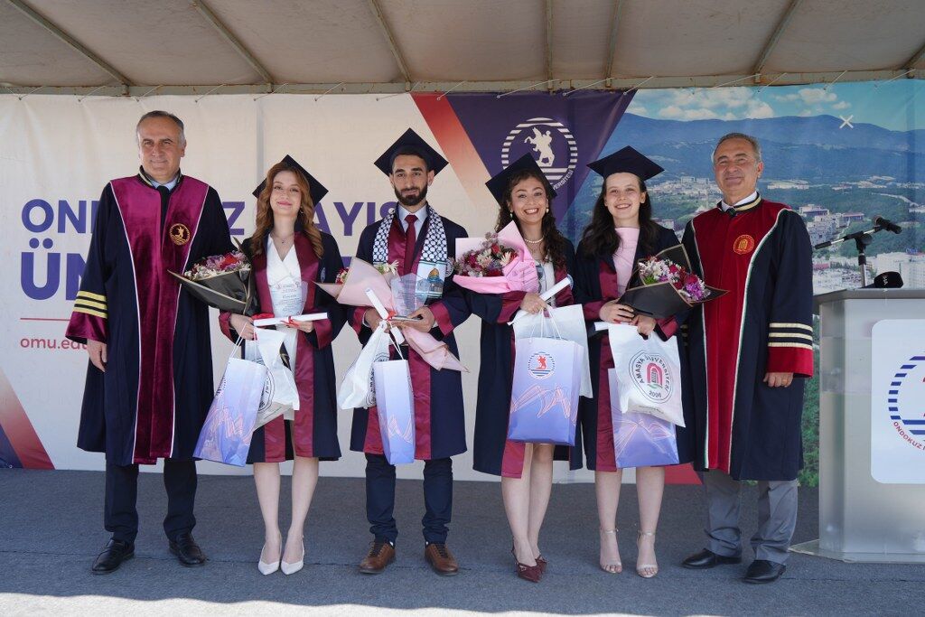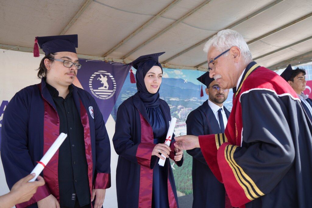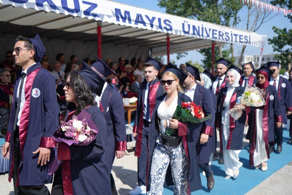 OMÜ Yaşam Merkezi’nde düzenlenen mezuniyet töreni, öğrencilerin geçişiyle başladı. Program, saygı duruşu ve İstiklal Marşı’nın okunmasıyla devam etti.