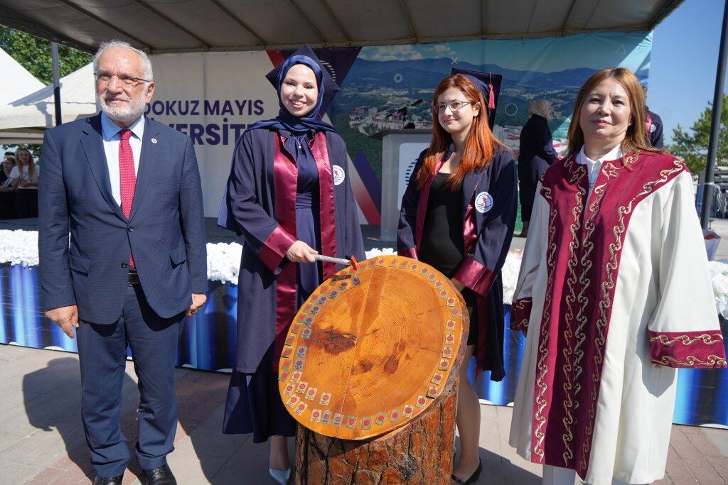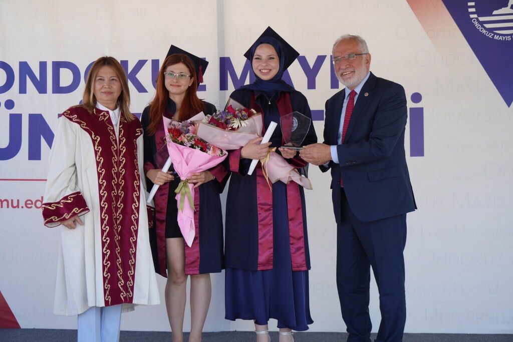 Mezun olan öğrenci ve ailelerini tebrik eden OMÜ Rektörü Prof. Dr. Fatma Aydın ise "Hayata emin adımlarla atılmak için ‘mezun’ sıfatı taşımak gerek şarttır ama yeter şart niteliği taşımaz. Bireyin mesleki yetkinliği yanında kişisel özelliklerinin de geliştirilmesi, ufkunun derinleşmesi, yüksek vasıflar edinebilmesi artık akademik süreçlerin ana hedefleri hâline gelmiştir. Ülkemizin aydınlık yarınlarına omuz verecek nesillerin, geleneği geleceğe taşıyıp ilmin rehberliğinden şaşmadan yol alırken, arkalarında koskoca bir tarihin yattığını bilmeleri gerekir. Ondokuz Mayıs Üniversitesi ailesi olarak yarım asırlık tecrübemizle ülkemizin en köklü yükseköğrenim kurumlarından biri olmanın ayrıcalığını yaşamaktayız. Verdiğimiz nitelikli eğitimin yanı sıra sunduğumuz bilimsel, kültürel ve sosyal imkânlarla öğrencilerimizi rekabetçi fertler olarak geleceğe hazırlamaktayız. Çünkü biz, eğitimi sadece bireysel başarıya değil, ortak geleceğimize yapılan bir yatırım olarak görüyoruz. Artık hayat yolculuğunda yeni bir eşiğin başındasınız. Üzerinizde taşıyacağınız beyaz önlükler gibi bembeyaz bir sayfa sizleri beklemekte. Yaşayarak biliyorum ki zorlu bir mesleğin mensupları olacaksınız. Mesleğinizi icra ederken hayata tutunmalarına yardımcı olduklarınızın duaları, en büyük ruh katığınız olsun" diye konuştu.