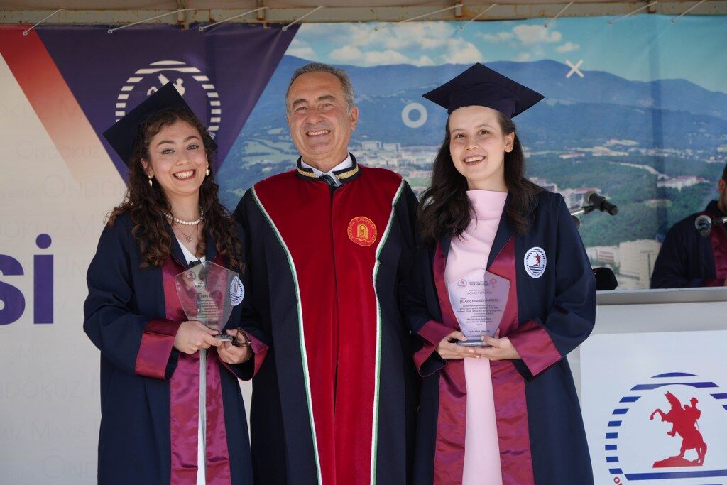 Tören İngilizce bölüm birincisi Ladin Ay ve Türkçe bölüm birincisi Rabia Çakmak’ın konuşmalarının ardından dereceye giren mezunlara plaket ve hediye verilmesi ile devam etti. Daha sonrasında mezunlar kütüğüne 2024-2025 mezunları adına Ay ve Çakmak tarafından isimlerinin yazdığı plaket çakıldı.