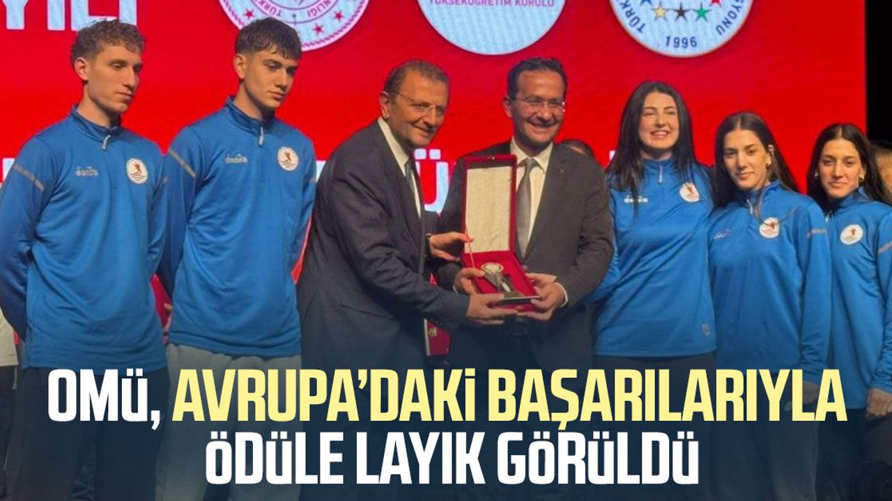 TÜSF Başkanı Prof. Dr. Mutlu Türkmen tarafından takdim edilen ödül, OMÜ Genel Sekreteri Erhan Burak Pancar ile Avrupa’da madalya kazanan sporcuların katılımıyla sahnede teslim alındı.