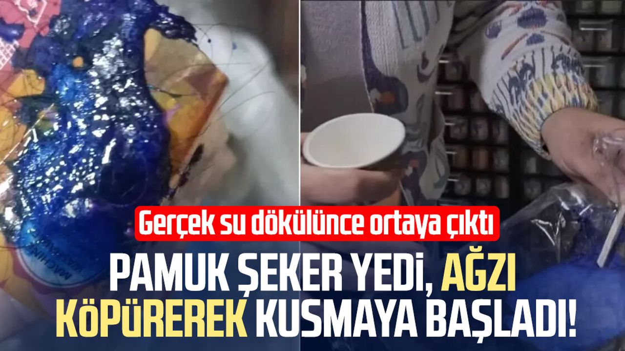 Fenalaşan çocuğun bir süre sonra kendine gelmesinin ardından anne Ulufer, pamuk şekere su döktü. Ürünün tamamen yoğun mavi gıda boyasından oluştuğunu fark eden anne, bu anları cep telefonuyla kaydetti.