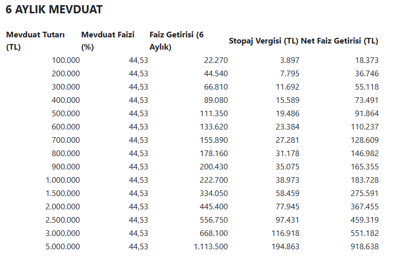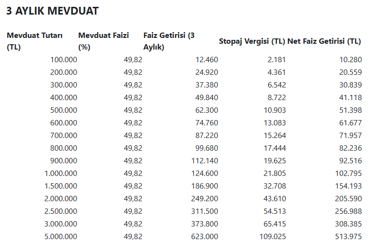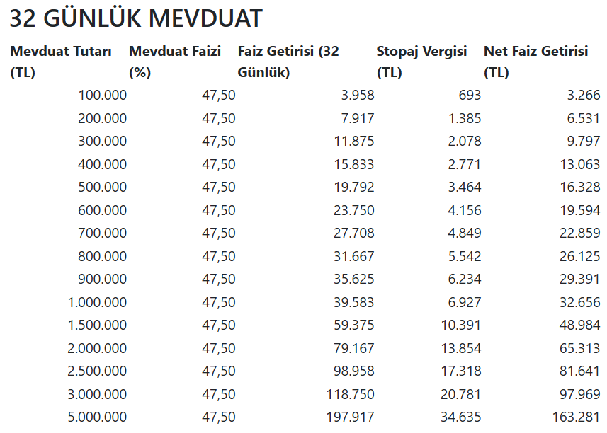 100 bin lirasını 1 aylık mevduatta değerlendirmek isteyen bir mevduat sahibinin faiz getirisi net olarak 3266 lira oluyor.